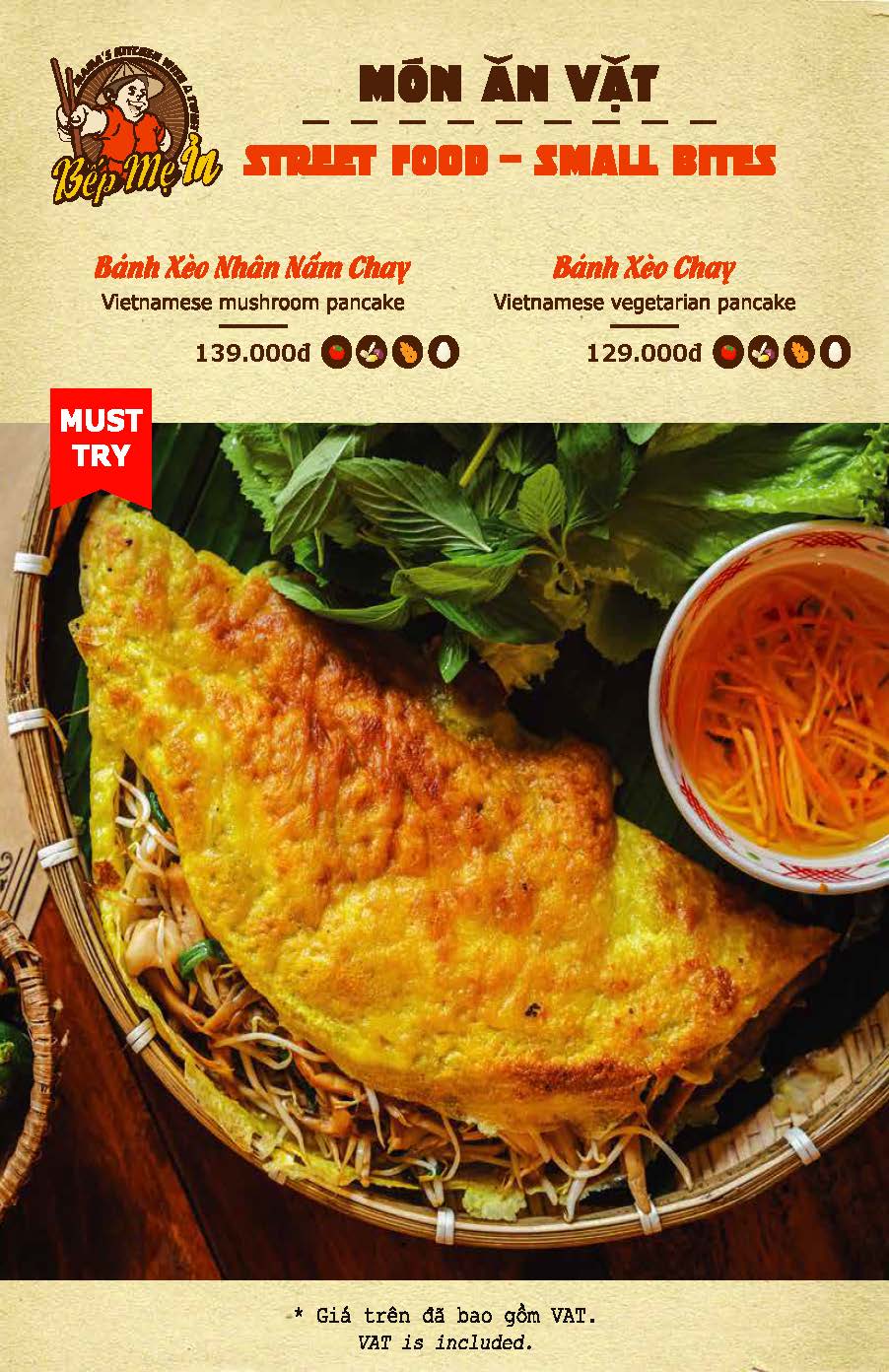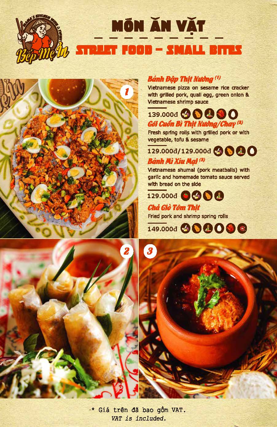 Check out our Menu STREET FOOD - SMALL BITES FAMILY FOOD - MAIN DISHES DRINK + DESSERT Reservations Book a table bepmein 1 - le thanh ton Hotline +842822111119 Facebook messenger Address bepmein 2 - nguyen thai binh Hotline +842822111119 Facebook messenger Address